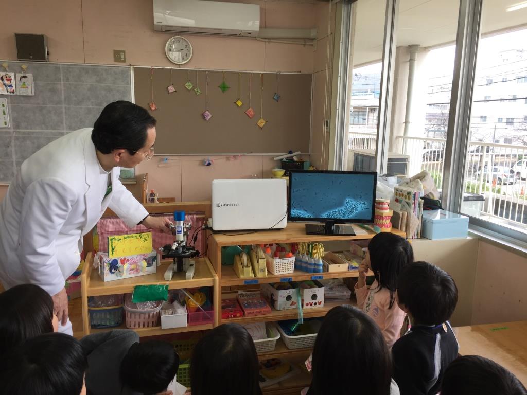 今年も園児のお口の中にいる細菌を実際にみてもらい、みんなびっくりしていました。歯の構造や虫歯がどうやって進んでいるのかも動画で見てもらい、興味津々のとてもかわいい園児たちでした。 最後は歯みがき指導を行い、残っている歯垢を赤く染めだし、熱心に歯みがきの方法を聞いてくれて、実際にみがいてもらい、みんなきれいなお口が仕上がりました! 卒園生の皆さん、小学校に進級しても歯みがき頑張ってくださいね!卒園おめでとうございます