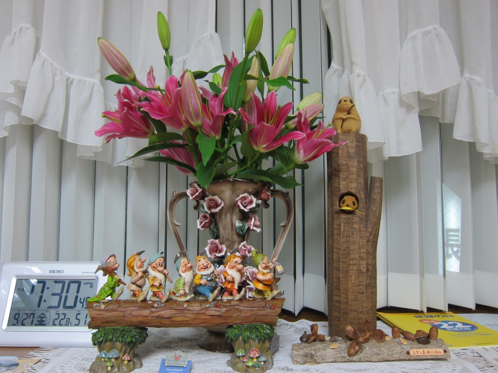 患者様からきれいなお花を頂きました!頂いたお花、保育園の園児の皆さんが作ってくださった飾り、そして気に入って購入した置物とがそれぞれよくあっていて、待合室も豪華な雰囲気になりました