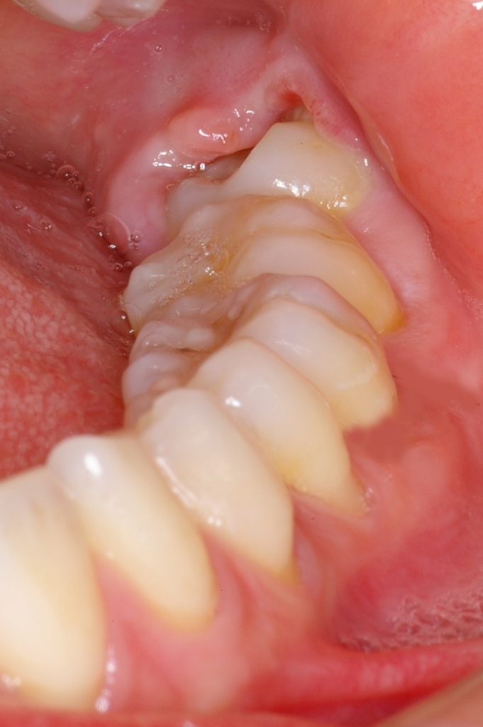 今週疲れがたまって、つらい思いをした私からの実感のこもったメッセージです ですが、厄介のことに、腫れている時はおやしらずの抜歯はできません。炎症がある状態では麻酔も効きづらいですし、刺激を与えることで炎症を周囲にまで波及させてしまうことがありますし、なおかつお口がいつもより驚くほど開かないので、抜歯操作そのものが困難なのです。智歯周囲炎になってしまった時は、まずは化膿止め(抗生剤)を服用して、炎症をおさえることとその部位の洗浄などが必要となります。私も2回目の智歯周囲炎のつらさを経験し、ついにはこの親知らずも炎症が治まったら抜いてもらおうと決心しました 現在抗生剤2日間服用して、症状が少し軽減傾向にある自分の口の写真です。(恥ずかしながら… 写真一番奥の親知らずの周りの歯肉が腫れているのがお分かりになると思います (非常勤:長谷川真弓)