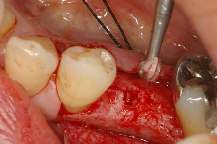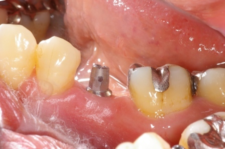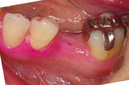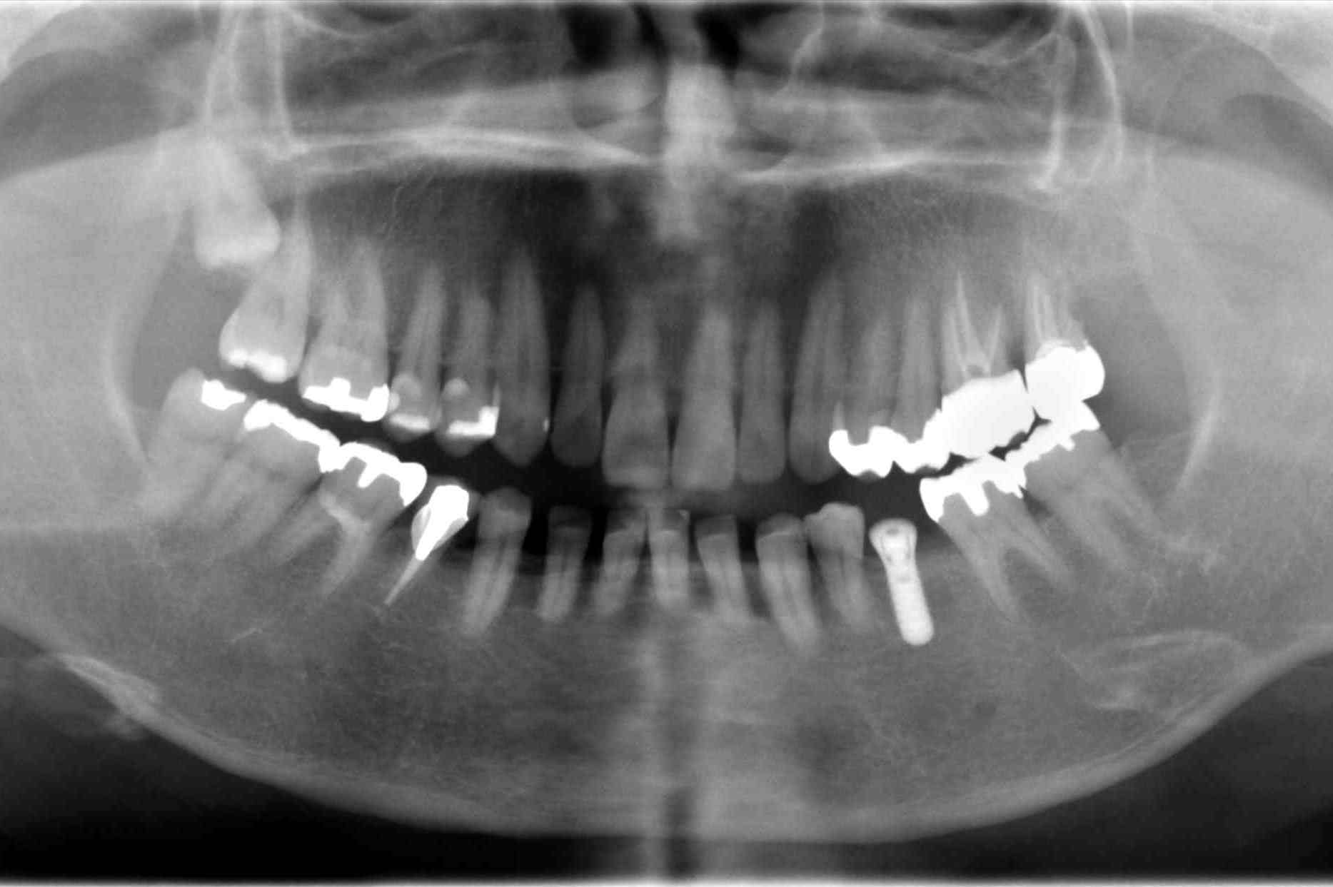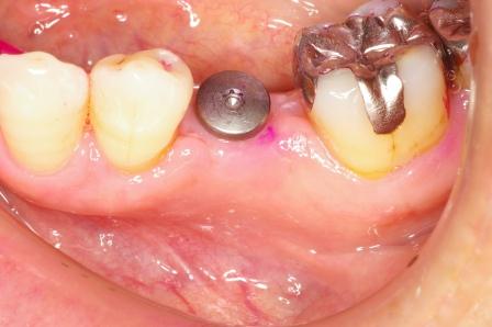 歯の根っこにひびが入り、抜歯となった左下にインプラント(人工の歯根)を使って歯を入れました
